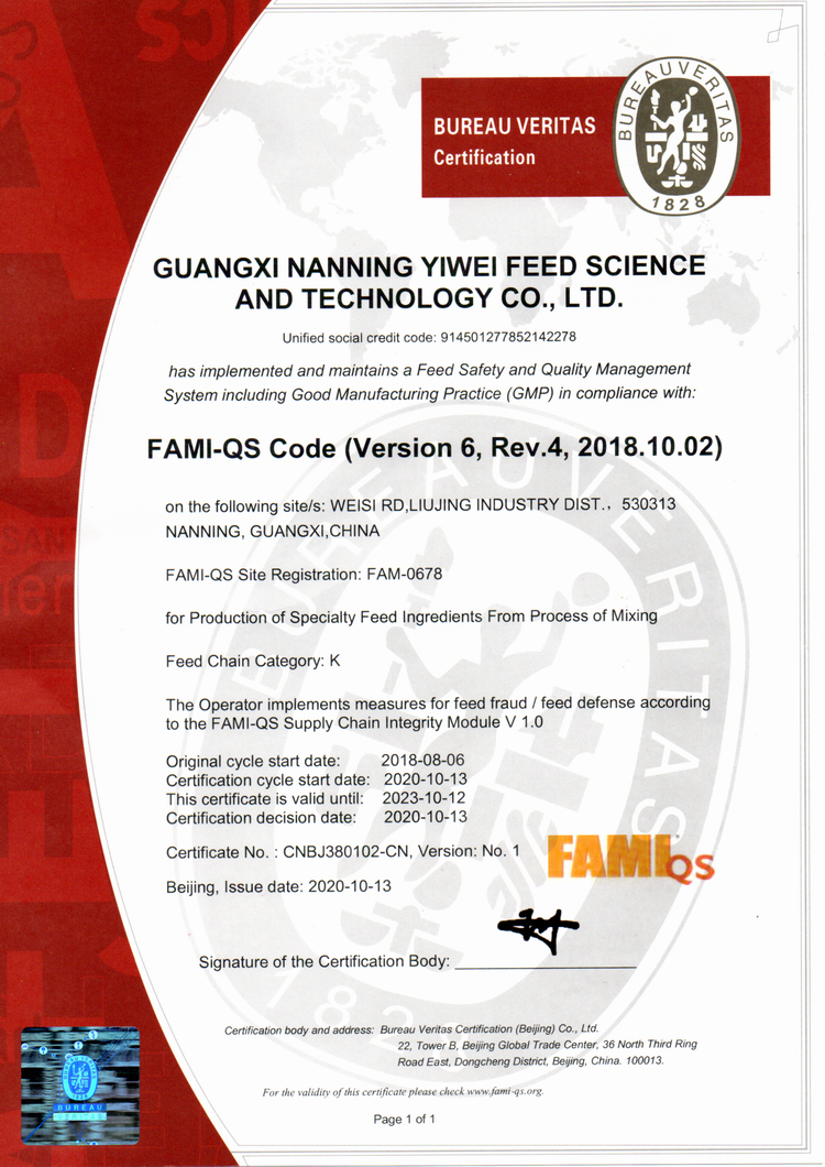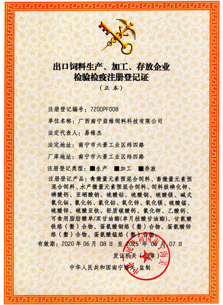 益維—出口飼料生產(chǎn)加工存放企業(yè)檢驗(yàn)檢疫注冊登記證